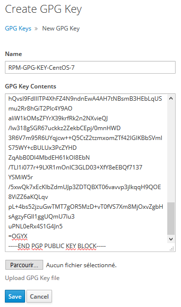 - GPG Key content : you can copy & paste the content of the GPG key in the form, of you can use the Upload button to upload the GPG key.
